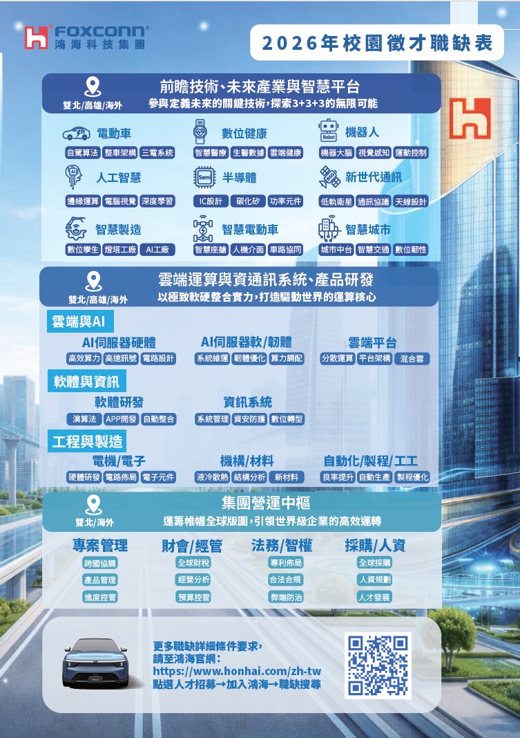 🚨 搶先預告! 鴻海2026校園徵才系列活動正式啟動,不論你是文科或理科背景,新生代菁英全面集合,一起開啟屬於你的職涯新篇章 🚀✨